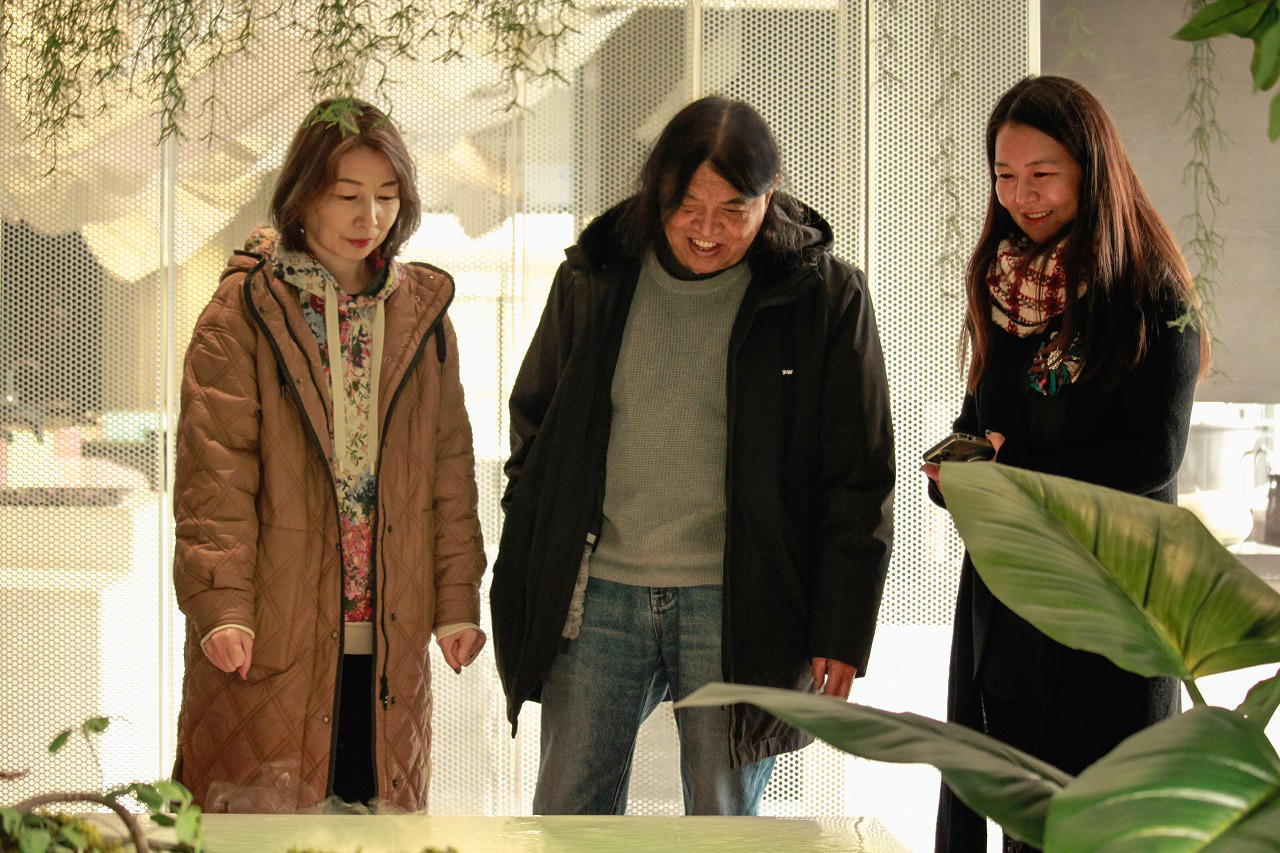 作为对苏州江南水乡绘画最有发言权的人,杨老师也注意到展厅设计中的苏州江南元素,相较于大面积直接式的设计方式,杨老师非常认可婉转、含蓄的设计表达,卫浴套间的移步异景,烟雨、绿植氛围营造,让人产生穿越时空的错觉。
